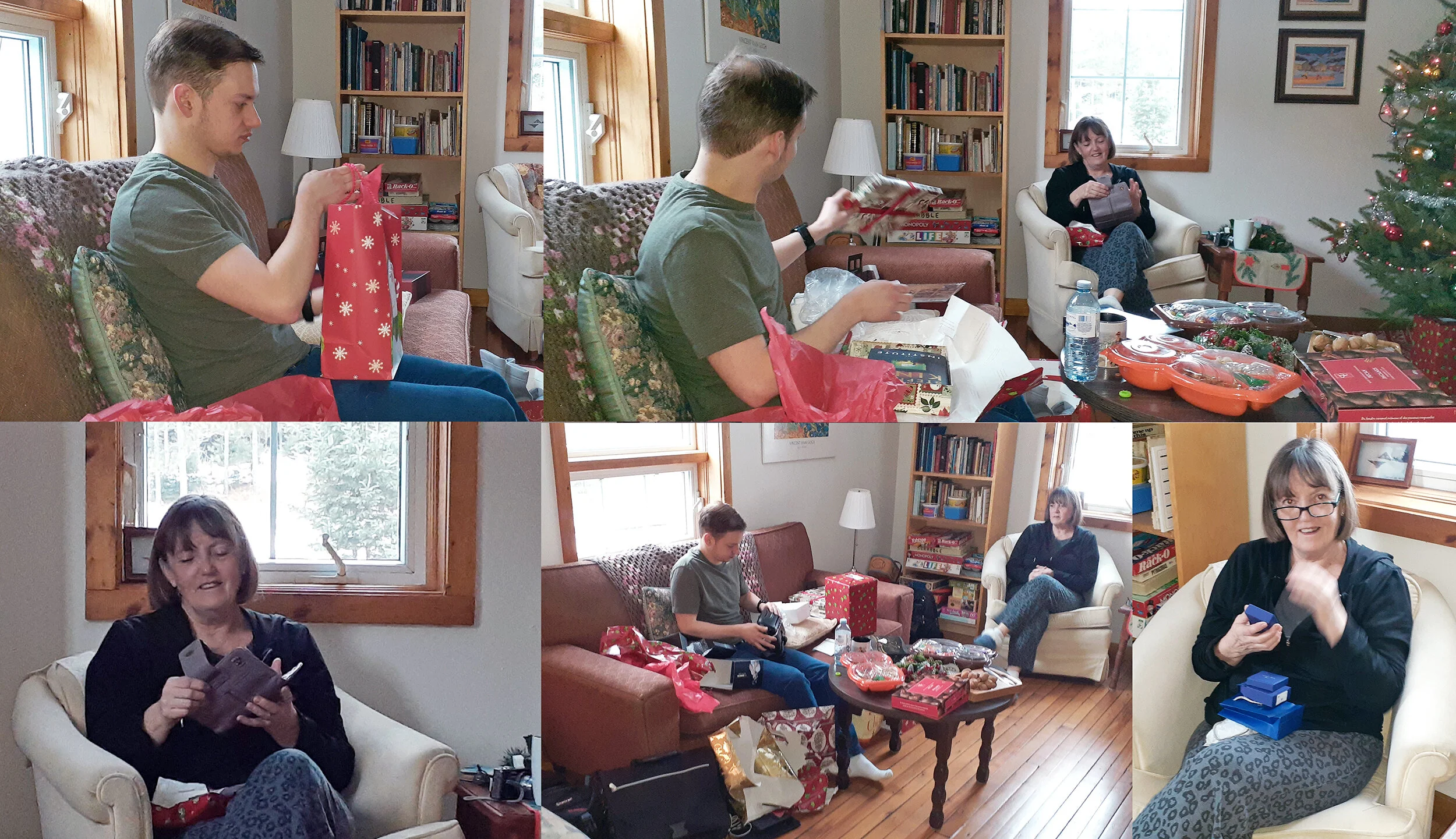 Opening gifts on Christmas morning.